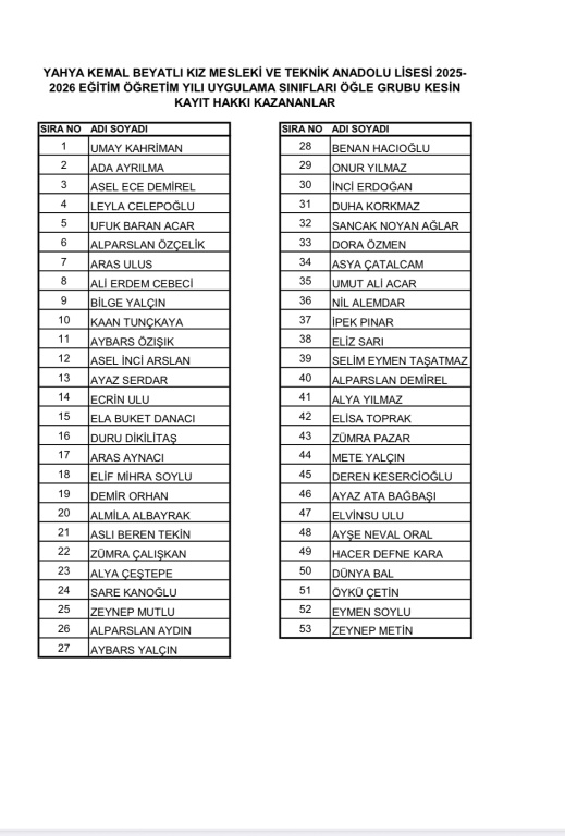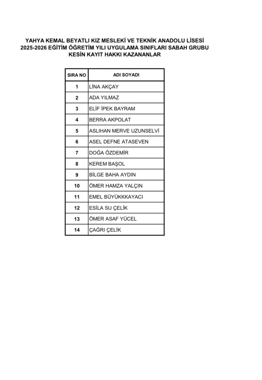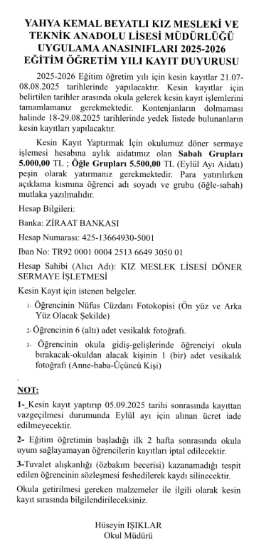 Okulumuz uygulama anaokulu kesin kayıt duyurusu ve kesin kayıt listeleri duyurusudur. 2025-2026 Eğitim öğretim yılı için kesin kayıtlar 21.07-08.08.2025 tarihlerinde yapılacaktır. Kesin kayıtlar için belirtilen tarihler arasında okula gelerek kesin kayıt işlemlerini tamamlamanız gerekmektedir..